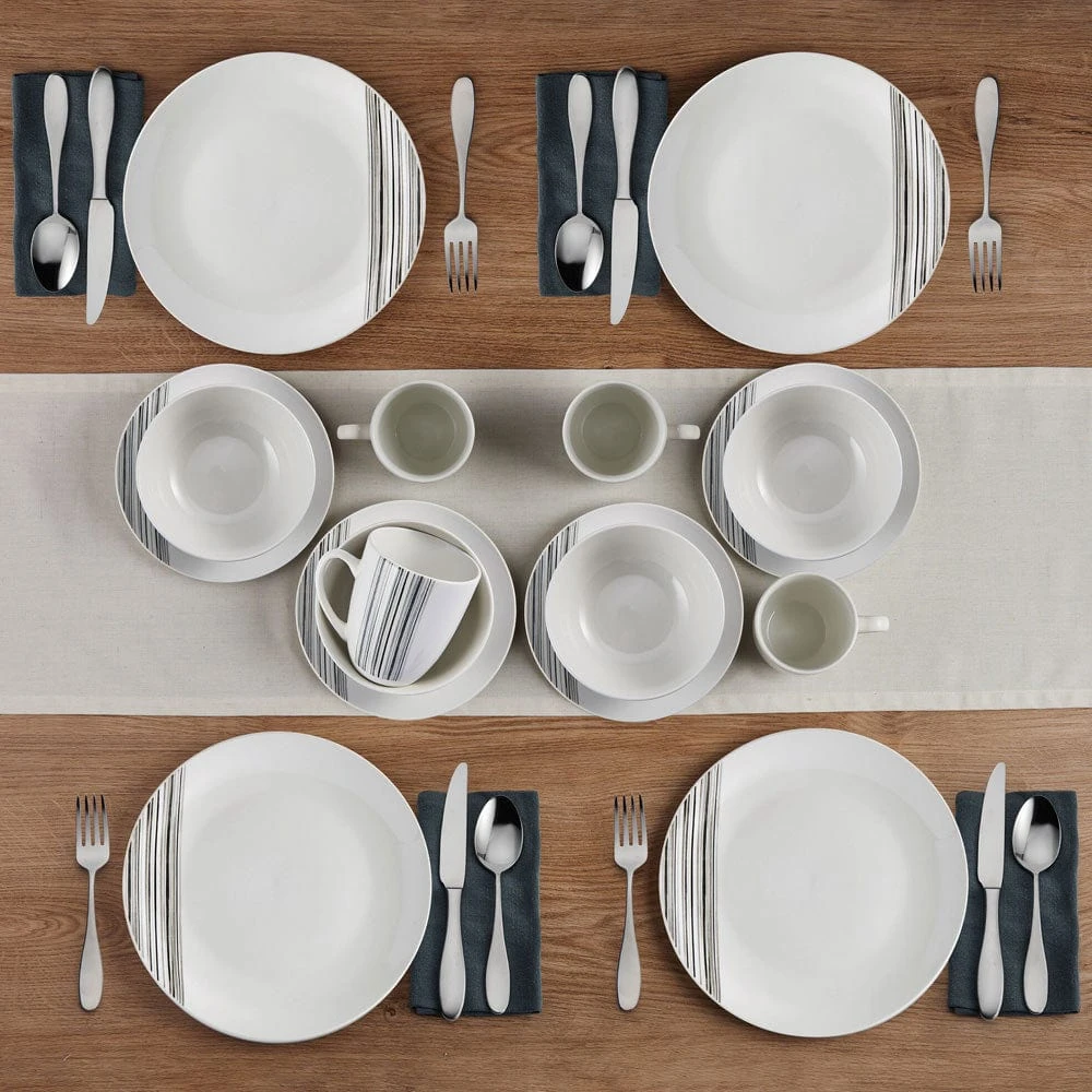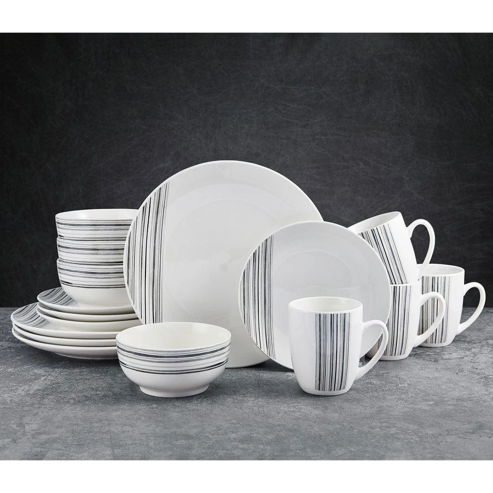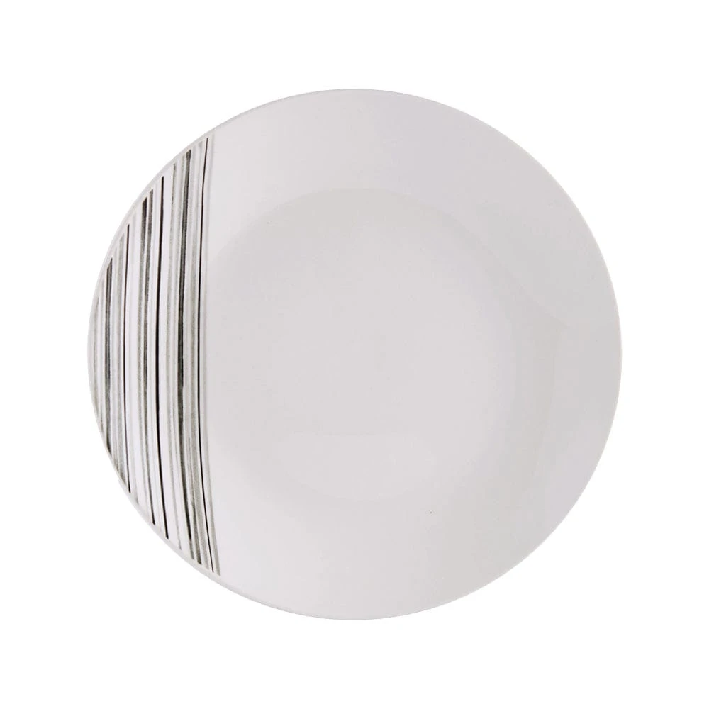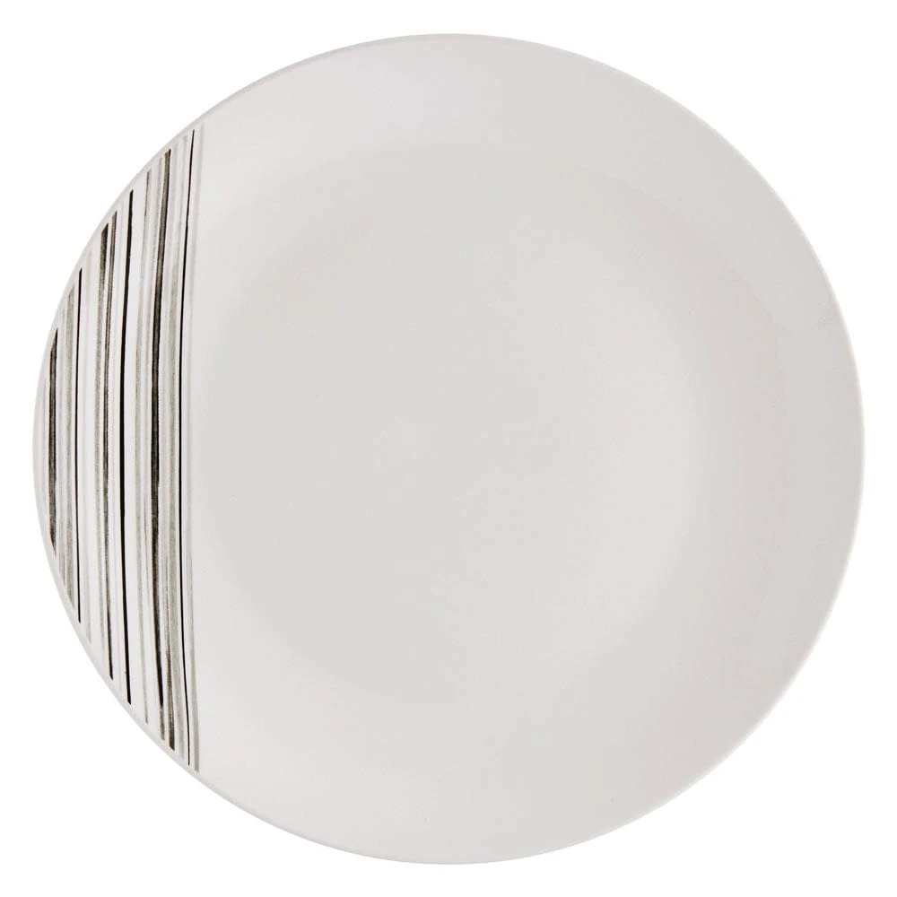 From the Studio Nova Brand, Brushed Lines Dinnerware captivates with a simple black brush stroke band running up one side of each crisp white piece, and will add a touch of sophistication to any dinner gathering.