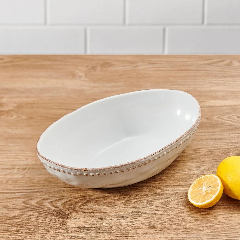 This Canyon Bead Oval Serve Bowl features a unique, warped shape, with large yet subtle dents on the surface, and a beaded band encircling the rim, adding a rustic and contemporary accent to your table.