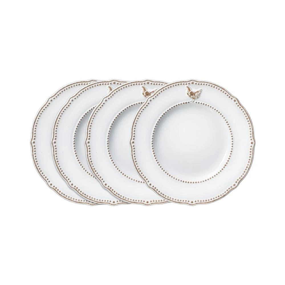 These plates are great for salads, but can also be used for a sandwich and chips, dessert or a snack. Crafted of stoneware. Microwave and dishwasher safe. Set of 4 salad plates, each measures 8-1/4 inch diameter.