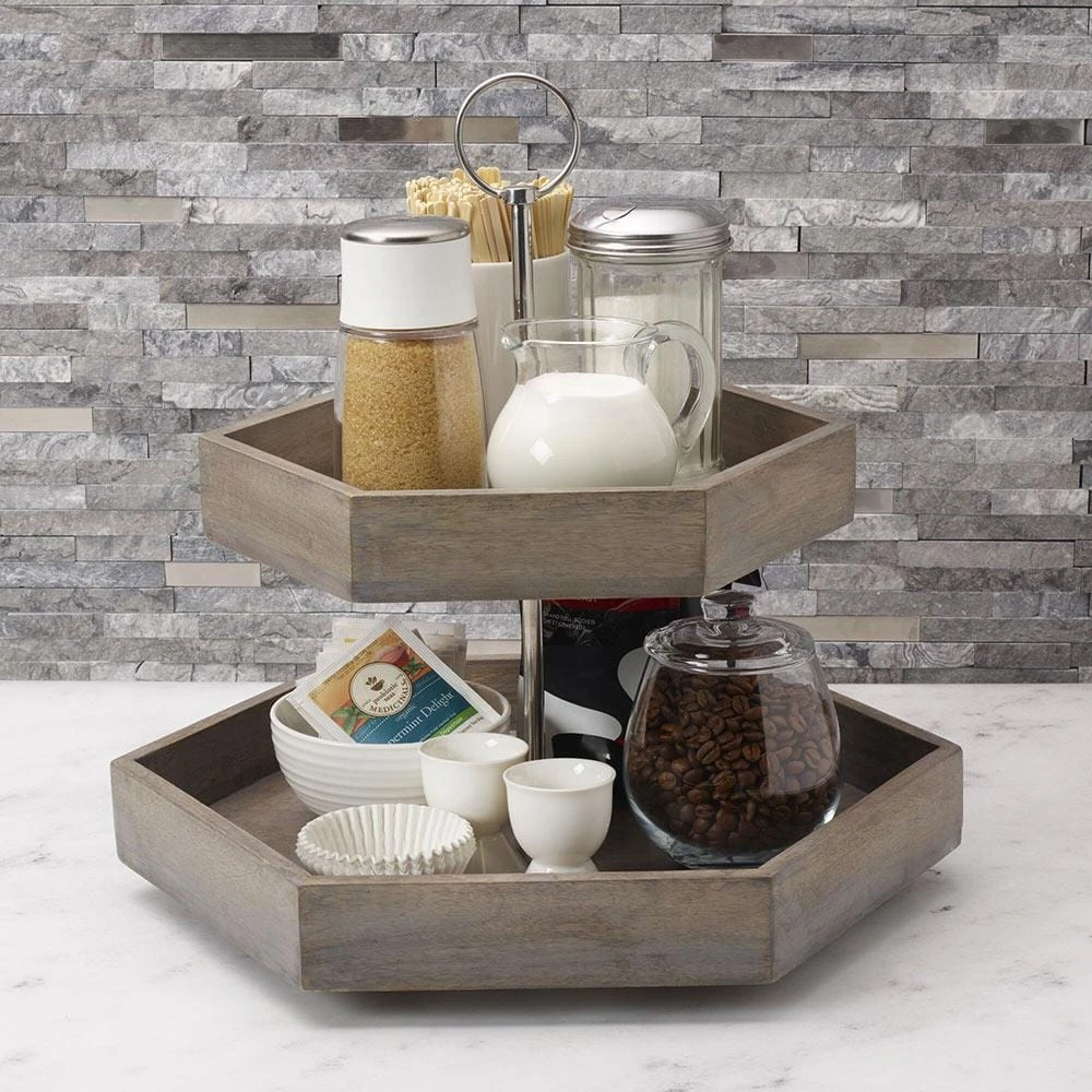 This Gourmet Basics by Mikasa Hexagon 2 Tier Mango Wood Tray will double your self-service space on a dinner table, picnic table, buffet table, or counter. Crafted of beautiful mango wood with an upper and lower platform, it provides twice the storage space and features high walls to ensure items stay on the trays. The durable aluminum post is topped with a strong carrying ring handle, and the unique hexagonal shaped trays feature a rustic gray finish. Wipe clean with a soft, damp cloth. Tray measures 15 inch high; top tray measures 12-3/4 inch diameter and lower tray measures 15-3/4 inch diameter.