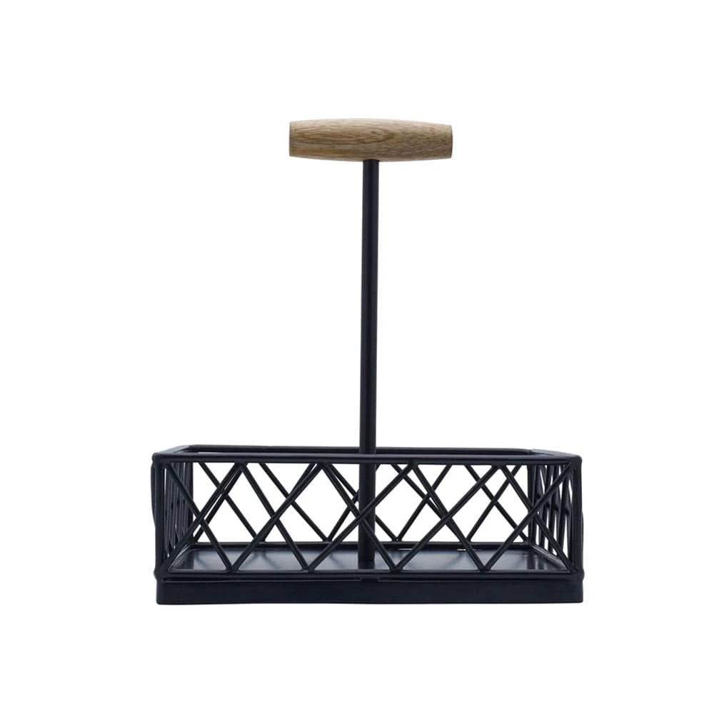 From the Gourmet Basics by Mikasa Collection, this Lattice Farm Condiment Caddy features a wire-framed wall that prevents items from falling off, while the built-in handle allows for easy transport. The black wire details and natural wood platform will complement any decor.