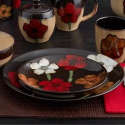 Crafted of stoneware. Each service includes: 10-1/2 inch dinner plate, 8-1/4 inch salad plate, 16 ounce soup cereal bowl and 13 ounce mug. Microwave and dishwasher safe.