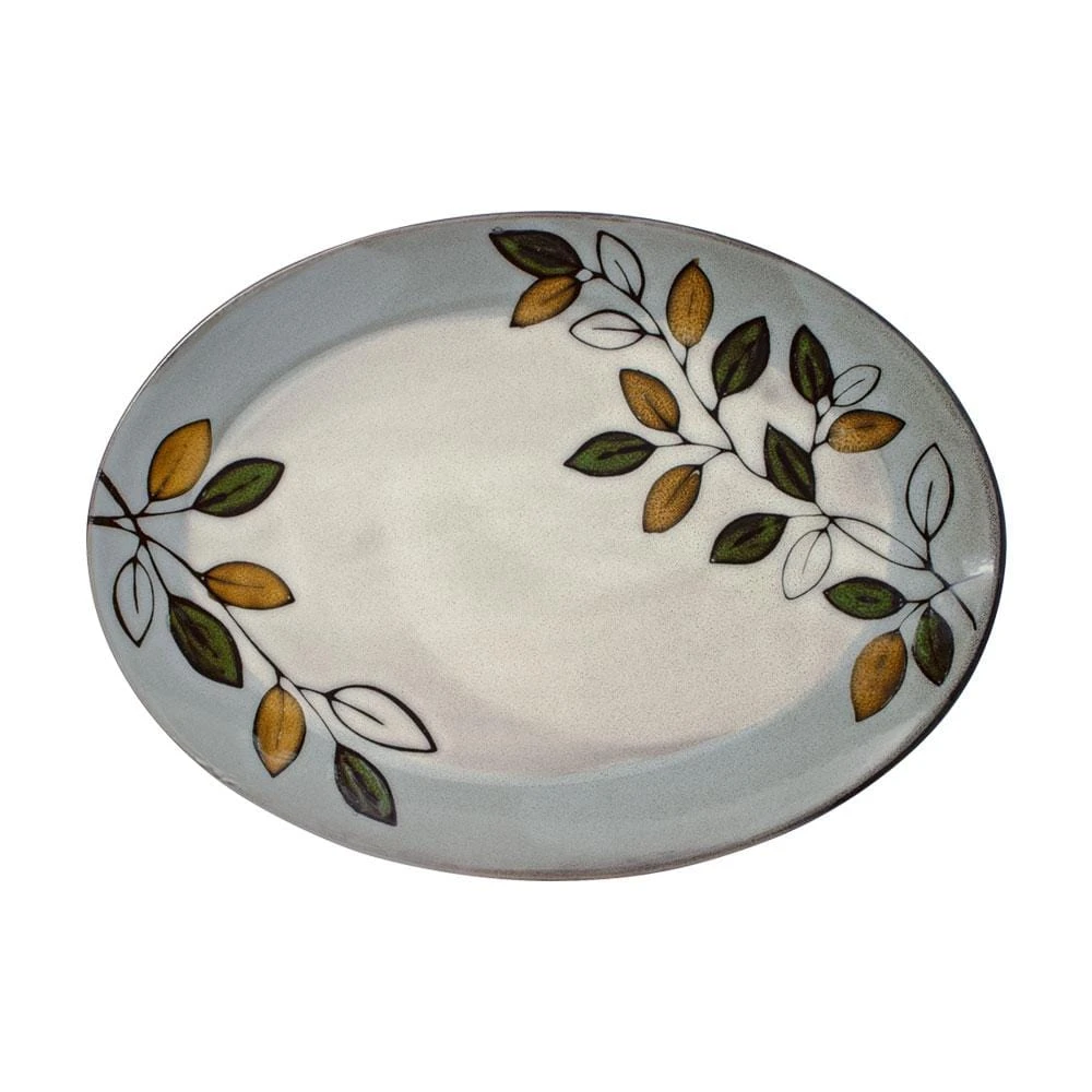Crafted of Stoneware, featuring a reactive glaze. Due to the nature and hand-crafted qualities of reactive glaze, no two pieces are exactly alike and will exhibit unique variations in color and pattern. Product may slightly differ from image shown. This is the perfect small serving platter. Great for hot dogs, hamburgers, pastries and more. Microwave and dishwasher safe. Oval platter measures 12-1/4 inch long x 9 inch wide.