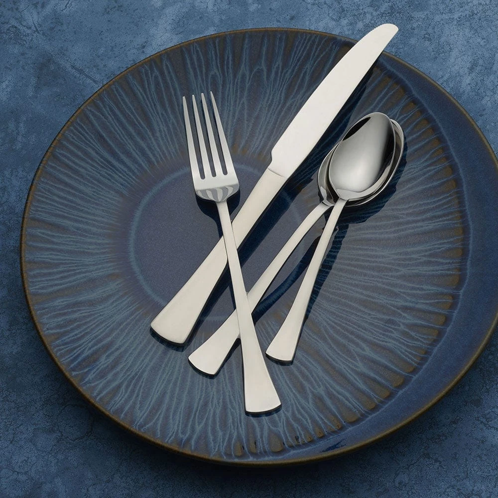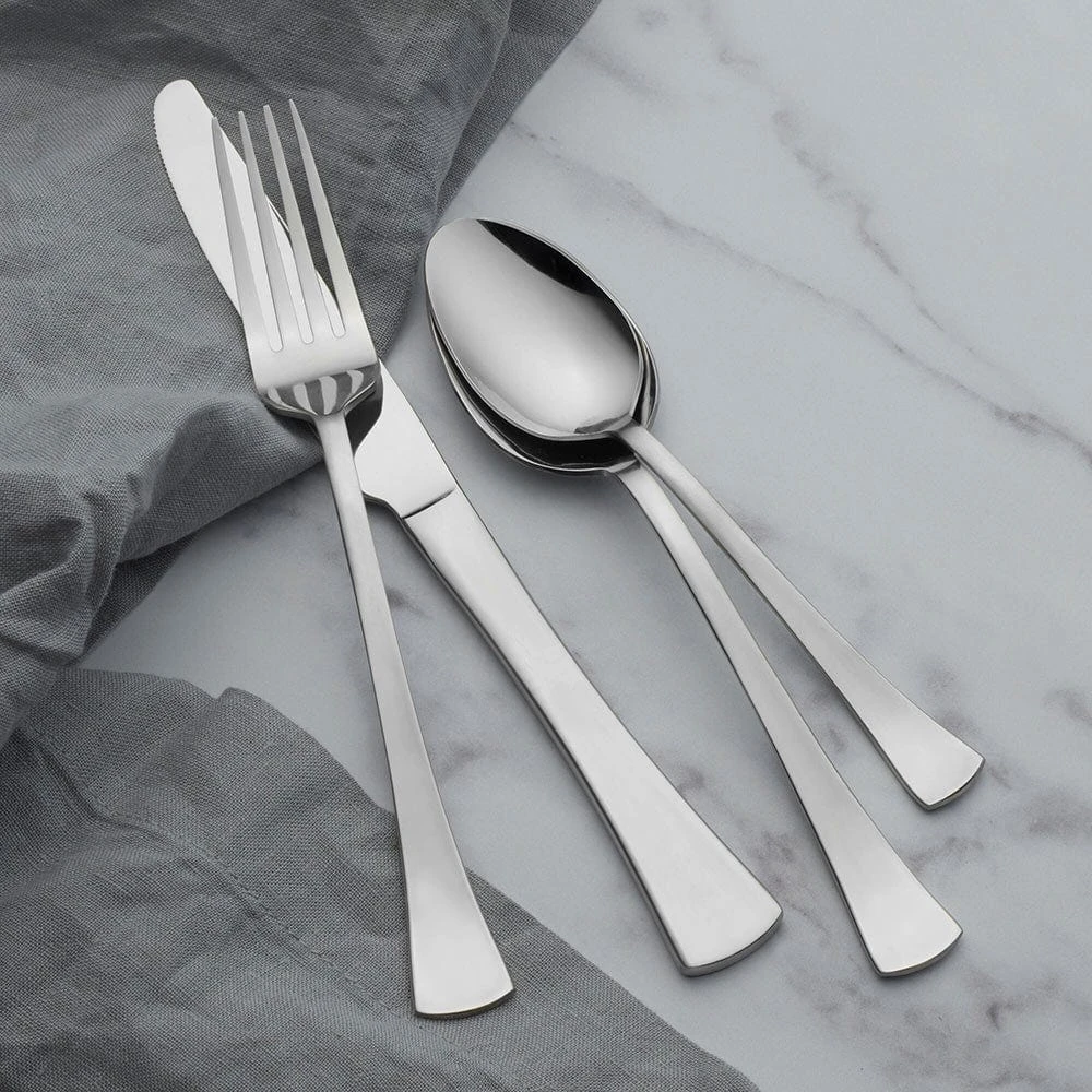 Outlet Deal for our Pfaltzgraff customers. This Scott Living Faye Flatware Set features sleek, slim handles with dramatic, curved, cut-away ends and a smooth finish that will bring a modern, minimalistic look to your tabletop.
