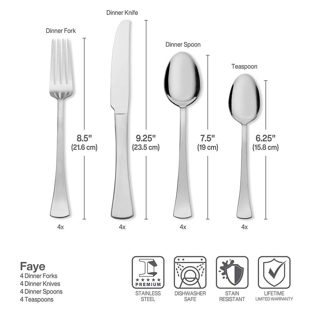 • Flatware Set for 4: This 16 piece flatware set includes (4) each of: dinner fork, dinner knife, dinner spoon, and teaspoon