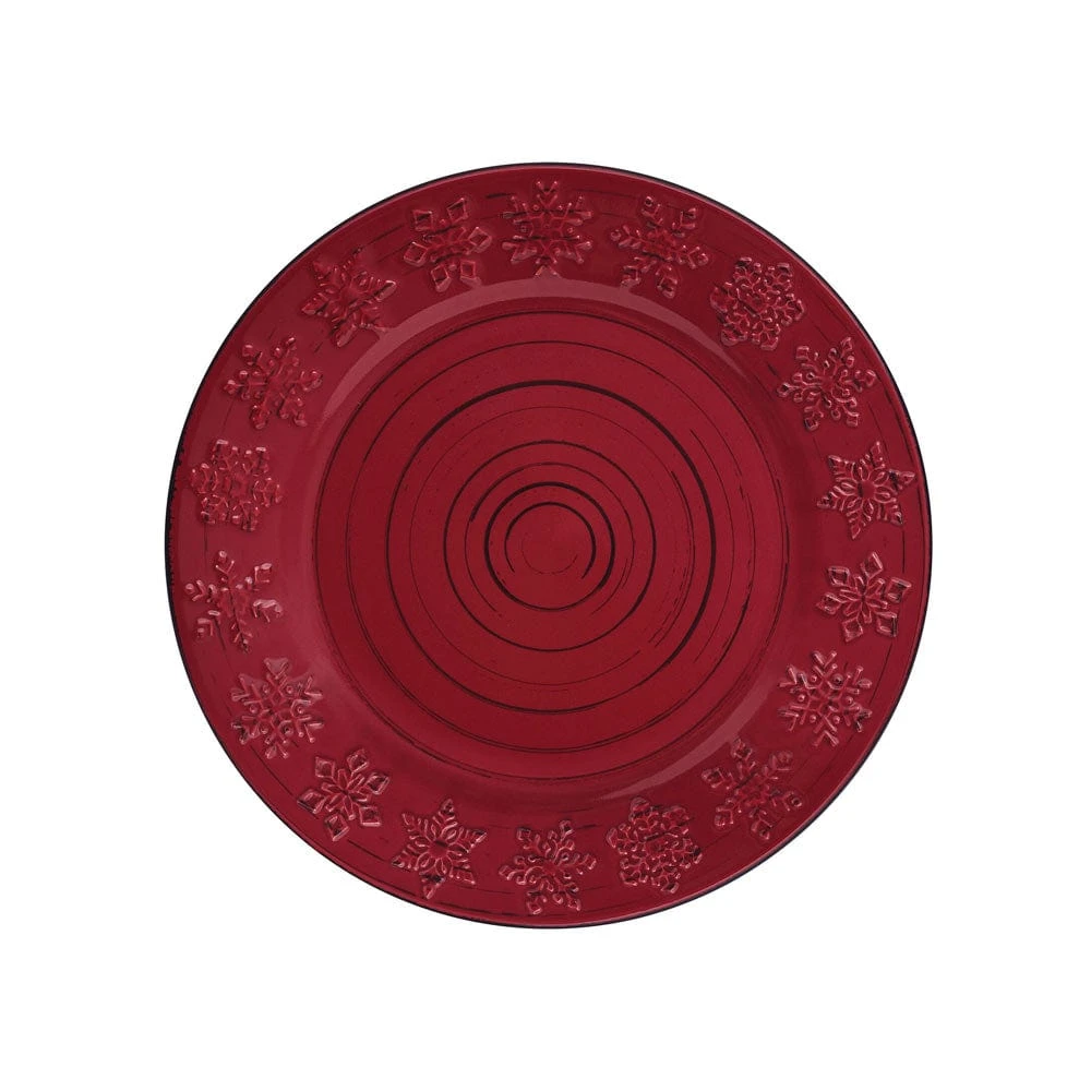 This Trellis Snowflakes Dinnerware Set features a bold red background glaze with dark striations swirling around each piece, giving it a weathered, rustic look, and the rim is adorned with a subtle, embossed snowflakes design, making this a perfect set for everyday dining during the holiday season and all winter long.